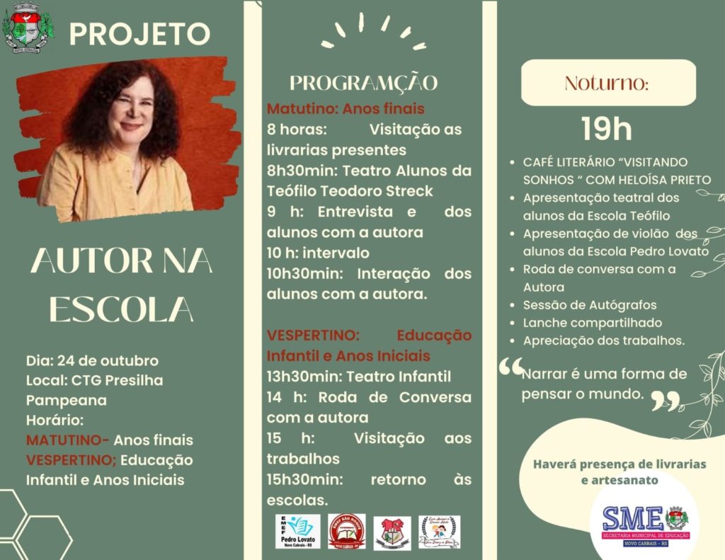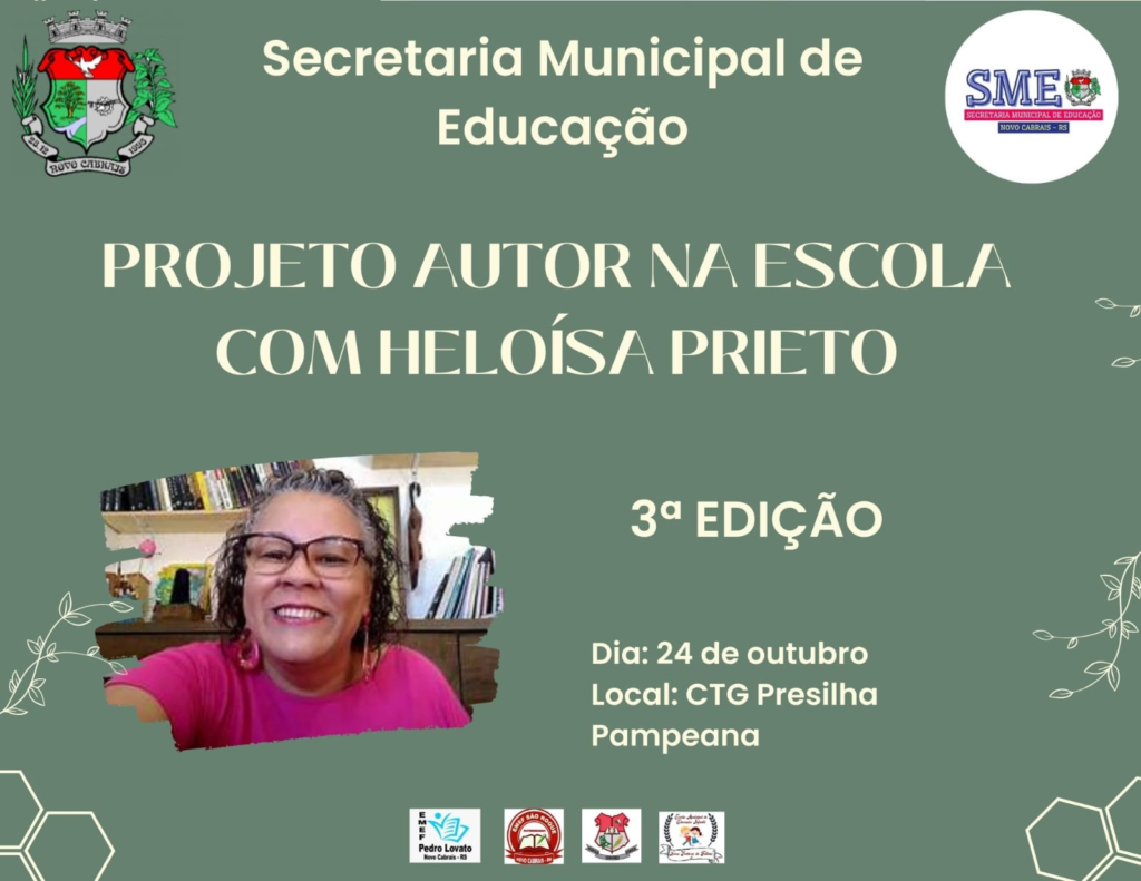 A Secretaria Municipal de Educação de Novo Cabrais promoverá, no dia 24 de outubro, a terceira edição do “Projeto Autor na Escola”, com a participação especial da renomada escritora Heloísa Prieto. O evento acontecerá no CTG Presilha Pampeana e contará com uma programação diversificada ao longo do dia, voltada para estudantes, professores e, à noite, para a comunidade em geral.